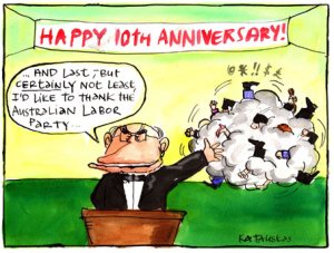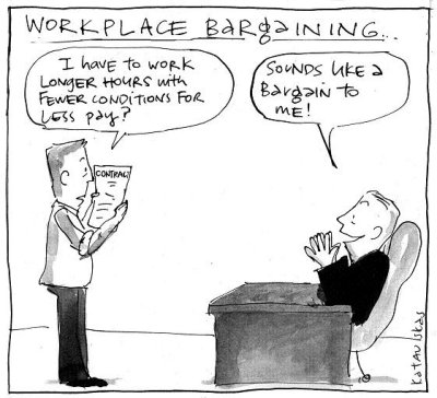 Cartooning - especially political cartooning remains my passion. It is quite a strange little world. There are very few of us across the country and, through events like the annual Stanley Awards (Australian Cartoonists’ Association) and the National Museum’s exhibitions of political cartoons, most of us know each other. It’s about a 95% male profession and, although I’m often asked why this is so, I’m still not sure. I think it’s more of a generation thing than a matter of sexism. Staff editorial cartoonists were largely hired when it WAS a more sexist environment and have stayed around since then. Because there are so few major newspapers in Australia, editorial jobs are highly sought after so nobody leaves until "he falls of the stool", as SMH cartoonist Alan Moir once said. This, as well as newspaper cutbacks, makes ![]() Fiona Katauskas - Workplace bargaining