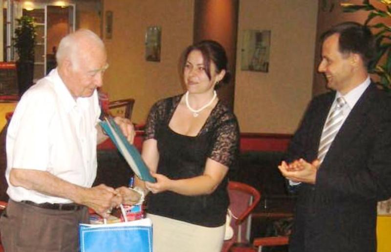The President of the Sydney Lithuanian Community, Greta Savickaitė-Fletcher (centre) making a presentation to the retiring Lithuanian Consul General Viktoras Šliteris in Sydney (left). ![]()