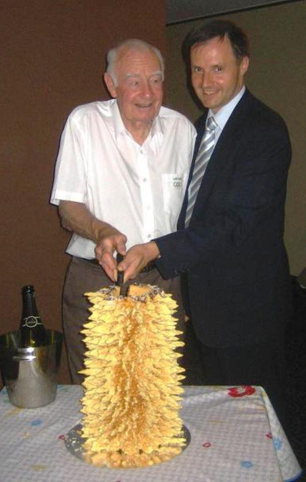 Ambassador Dainius Kamaitis and the retiring Consul General Viktoras Šliteris OAM cutting the Šakotis, a traditional Lithuanian cake for festive occasions. The Šakotis had been baked for the occasion by Rita and Gintaras Janulevičius of Sydney. ![]()
