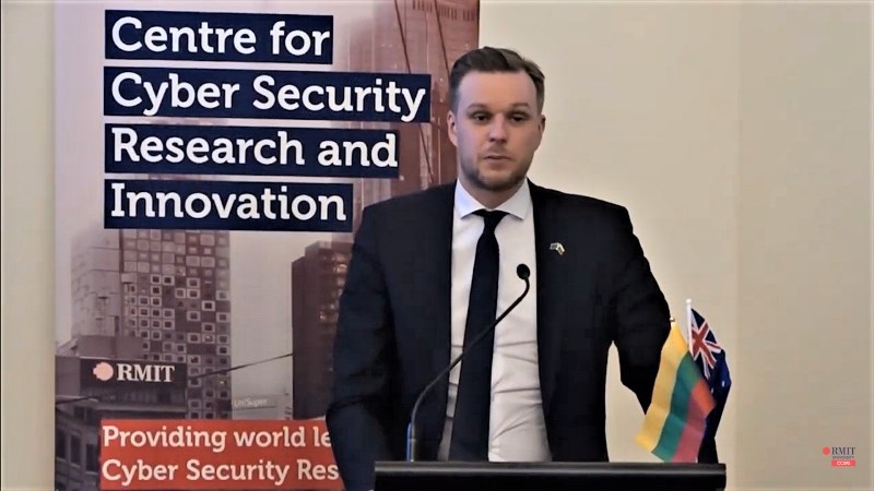 Gabrielius Landsbergis giving an address at RMIT University’s Centre for Cyber Security Research & Innovation. Photo courtesy RMIT University ![]()