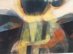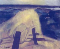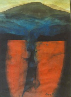 Kubbos was trained as a graphic artist basically in the German Expressionist style and in the early post-World War II period was exposed briefly to new art movements through art exhibitions that travelled through Europe. Here she saw the work of such artists as Picasso, Chagall, Braque and Kandinsky, but these experiences did not have an immediate effect upon her work. She has said: `I definitely didn't know what to see in these paintings, and I suppose in my mind all these elements of new art movements must have been rather confusing at that time ... I was not aware of so much at that time.' Kubbos's work has undergone great changes in style and media and can be grouped into two periods: 1956-1963, her graphic period; and from 1963 her painting period. In her graphic period, she remained for some time within the bounds of figurative expressionism, but some of her first woodcuts in Australia, although figurative, are executed in softer style, approaching French post-impressionism more than German expressionism. Her association with avant-garde Sydney artists who were experimenting in abstract expressionism led her to begin to change style and subject matter, working with semi-abstract linoprints and silk screens based on dormant mythological ideas, as in Myth, 1961. In this linoprint, strong lines accentuate the spiritual, indefinable aspects of the myth and reflect the influence of abstract art. From this experimental period comes an abstract linocut, Untitled, 1962, in which predominantly linear elements, reinforced with solid colour planes, begin to form circular shapes from the apparently amorphous pictorial space. Distribution of geometric shapes and their linkage by broad, decisive lines display a strong, underlying compositional element which in her later paintings is more difficult to discern. Responding to new ideas, Kubbos searched for new ways of expression, new media and new subject matter. Abstract expressionism emphasised spontaneity and gestural characteristics, and wood and linocuts were not the most suitable media in which to display such features. Kubbos experimented with oil painting but has remained with watercolour, gouache and acrylic, finding that they offer greater possibilities to express spontaneity and immediacy. Most often she uses all three in the same painting: for sombre ideas she uses the more solid and opaque acrylic or gouache; for lighter, ethereal effects, transparent watercolour and its colour veils and layers. Her watercolour paintings are larger than those of most conventional watercolourists, but smaller than Ðalkauskas's paintings. Even in her largest work she is totally in control in organising the picture surface and imbuing it with dramatic tension through the use of bold composition and sensitive tonality. It is not, however, only the formal arrangement which makes her work appealing. Her subject matter - generally myth and landscape are her principal sources of inspiration - also has strong appeal. Kubbos has a pantheistic, mystical concept of the powers of the earth, sun and water, stemming from an upbringing in which these elements were held in great reverence. She expresses in her work an intense feeling towards Nature. Probably the most important symbol in her work, as also in Ðalkauskas's paintings, is the circle representing the sun. She has said, `The sun really has great significance for me. It goes back partly to my childhood in Lithuania. There were always celebrations -- almost pagan, going back for hundreds of years -- at midsummer, after the long, cold winters.' ![]() Eva Kubbos, "Sand Dune Sentinel", 1993