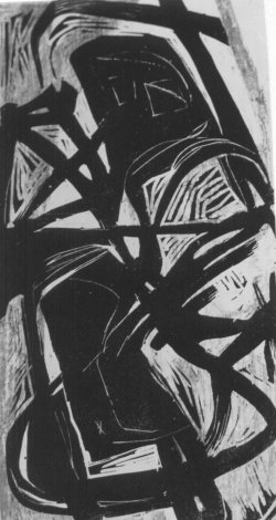 Kubbos was born into a farming family of six children in Didsilininkai village in the county of Ðilute in 1928. Her father died when she was eight. Following his death, the family experienced much hardship, but Kubbos's childhood memories are filled with the wonders of Nature. She began to draw at an early age. In 1944, at the end of the eighth year of her education, she fled with her family to escape the advancing Russian army. They settled temporarily in Mittweiden in Northern Germany where she found work with a tailor who, recognising her artistic ability, encouraged her to produce fashion sketches. From 1945 to 1950 she studied at the Hochschule fur Angewandte Kunst (College of Applied Art) in Berlin. In 1952 she arrived in Australia with her younger sister, Marta. They carried out two-year work contracts at a Shepparton fruit cannery and later, at a Brisbane biscuit factory. On completion of her contract, Kubbos worked in Melbourne as a window-dresser at Cann's Department Store. In 1955 she gained an award as top window-dresser in Melbourne and was promoted to the position of Advertising Manager. This encouraged her to continue art studies and in 1956 she enrolled at the Royal Melbourne Institute of Technology and later at Swinburne Technical College to study new techniques in graphic art. In 1958 she exhibited her work -- wood and linocuts -- for the first time in Australia at the Second Lithuanian Art Exhibition held at the Victorian Artists Society Hall in Melbourne. In 1960 she moved to Sydney, where she met Henry Ðalkauskas who was to become her friend and mentor for many years. ![]() Eva Kubbos, "Myth", 1961, woodcut