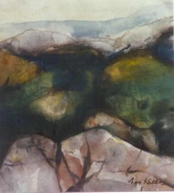 At times Kubbos's outlook on the forces of Nature mellows and she portrays them with greater benevolence. The dramatic aspects diminish and her paintings become statements of amicable worlds. Her forms become more defined and the paintings are rendered in a lighter colour scale with more tonal nuances, as in After the Rain, 1967. Of her solo exhibition in Adelaide in 1968, the art critic of the Weekly Times commented: `Kubbos ... is concerned with the mystery of life under the earth, which responds to the call of the seasons and the sun, and is forever being born, living and dying ... There is poetry in her painting, a love and a worship of this eternal power'. ![]() Eva Kubbos, "Landscape" 1982