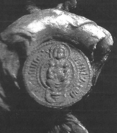 The family and and their court led to all appearances an unrestricted life in Prussia. Vytautas and Onas daughter Sophie married the Grand Duke Vasilii I of Moscow. The marriage was celebrated at the castle of Balga. Ringailė was also married to the Mazovian Duke Henry at the same castle. So 10 years of enmity elapsed between Vytautas and Jogaila, now King of Poland. It was a most turbulent period, interspersed with conspiracies and warfare between the two cousins. Ona foresaw that the only way Vytautas would regain his lands was by concluding a treaty with Jogaila. Thanks to her efforts the peace treaty was signed at Ostrow in Poland, not far from Lublin on August 5,1392. (N.B: The place name of Astravas is incorrect!). Ona had to pledge her husbands adherence to the stipulated demands. Duchess Ona signed two guarantee documents for Jogaila, the King of Poland, and for his wife, Queen Hedwig (Jadvyga). The documents contain Onas seal. The iconographic depictions on the seal reveal St Ann and two figures sitting on her knees. "By this treaty Vytautas acquired control over the entire ![]() The seal of Ona Vytautienė
